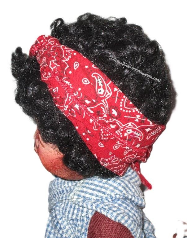 Hair, Eyes, Mouth: Short curly black synthetic wig with a red bandana headband, painted facial features in the Robert Zacher style.