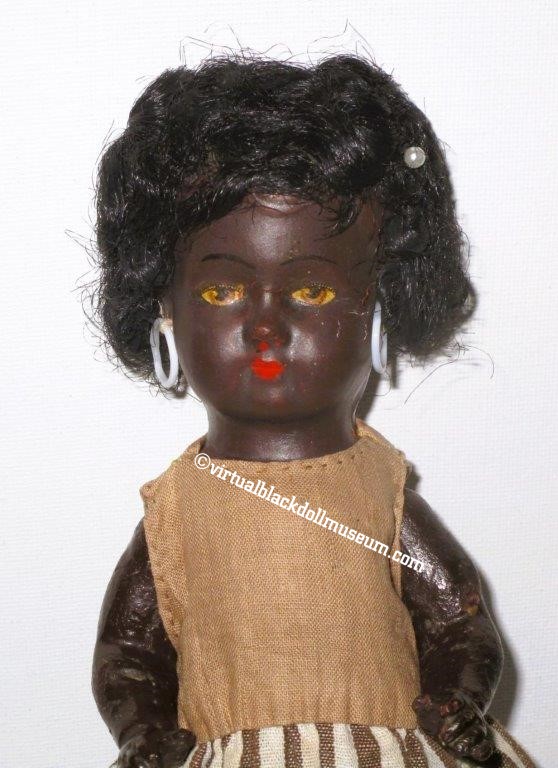 An early 1900s cabinet doll made in Germany has a celluloid shoulder head and a composition body. #antiqueblackdoll #1900sblackdoll #celluloidandcompositiondoll #dollmadeingermany