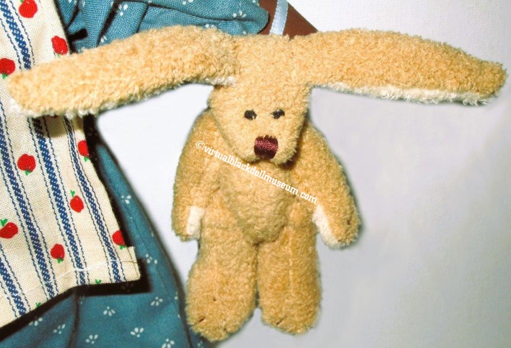 Clothes: The blue floral print dress has an attached apple-print pinafore that matches the fabric of the pantalettes. Brown faux leather side-button boots complete the fashion. Little E. holds a furry bunny rabbit. A heavy cardstock hang tag is attached to the doll’s right wrist with jute.