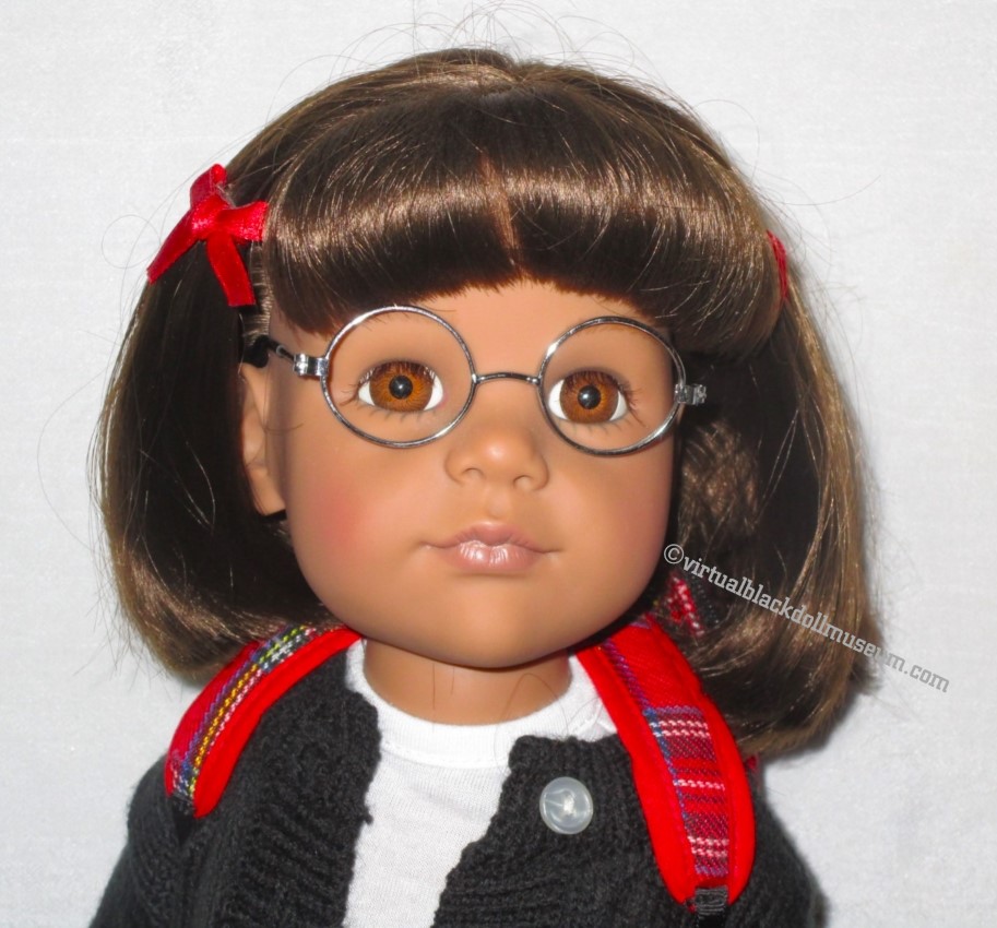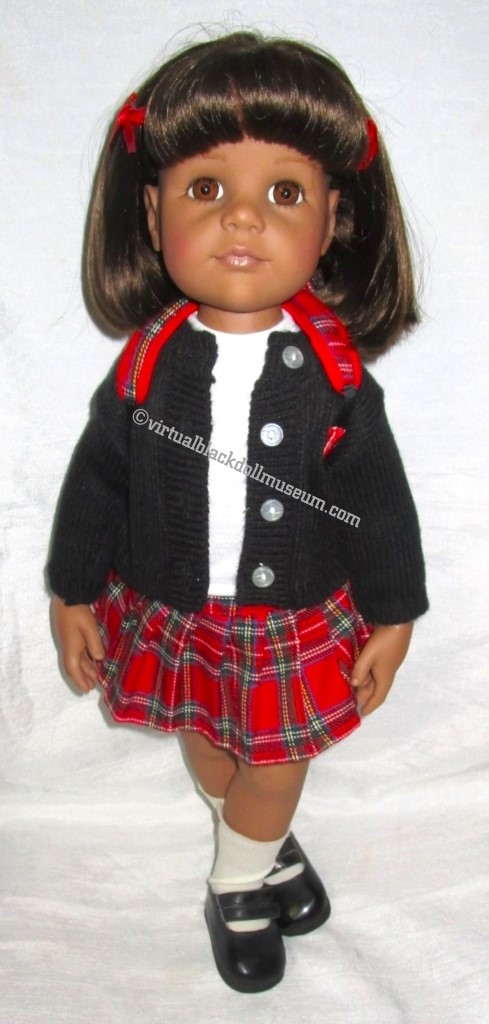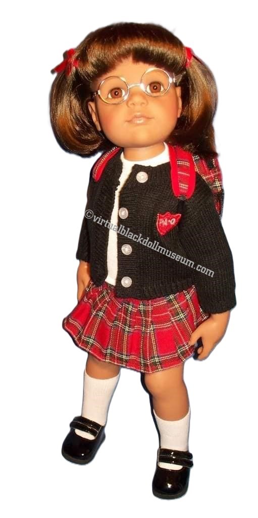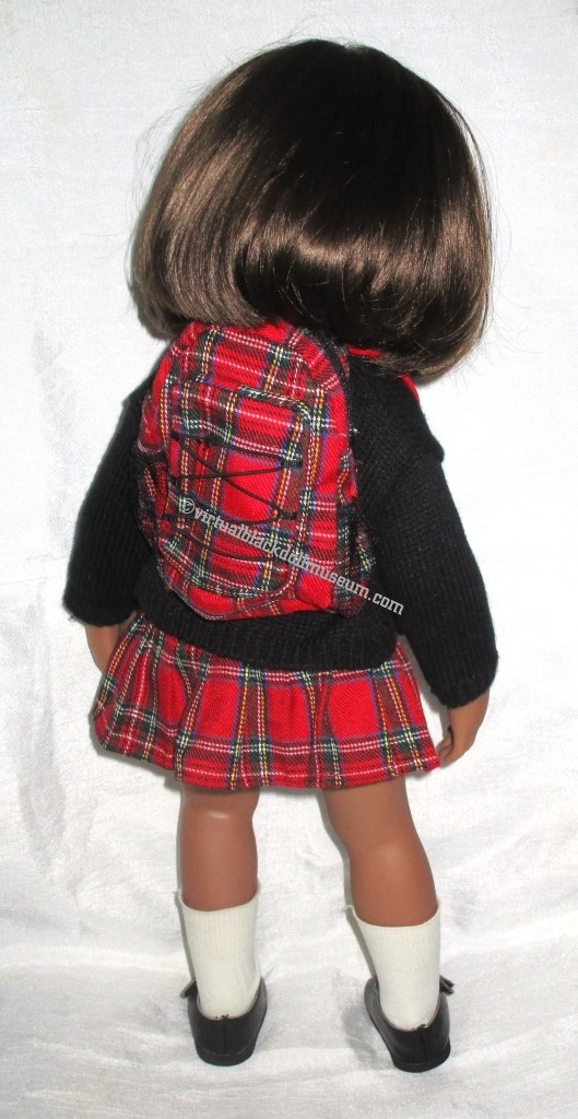 Clothes/Accessories: Claudia wears a schoolgirl uniform and carries a red plaid backpack that matches the pleated skirt. The skirt is paired with a white, short-sleeved top and a blue cardigan sweater featuring an FAO patch on the upper left front. White panties, white socks, and black leatherette shoes with double straps complete the outfit. Claudia was presented in a personalized red canvas carrying case with a see-through front panel. A soccer fashion that includes black kneepads and black sneakers, and a pair of silver-rimmed round eyeglasses are attached to the back panel of the carrying case.
