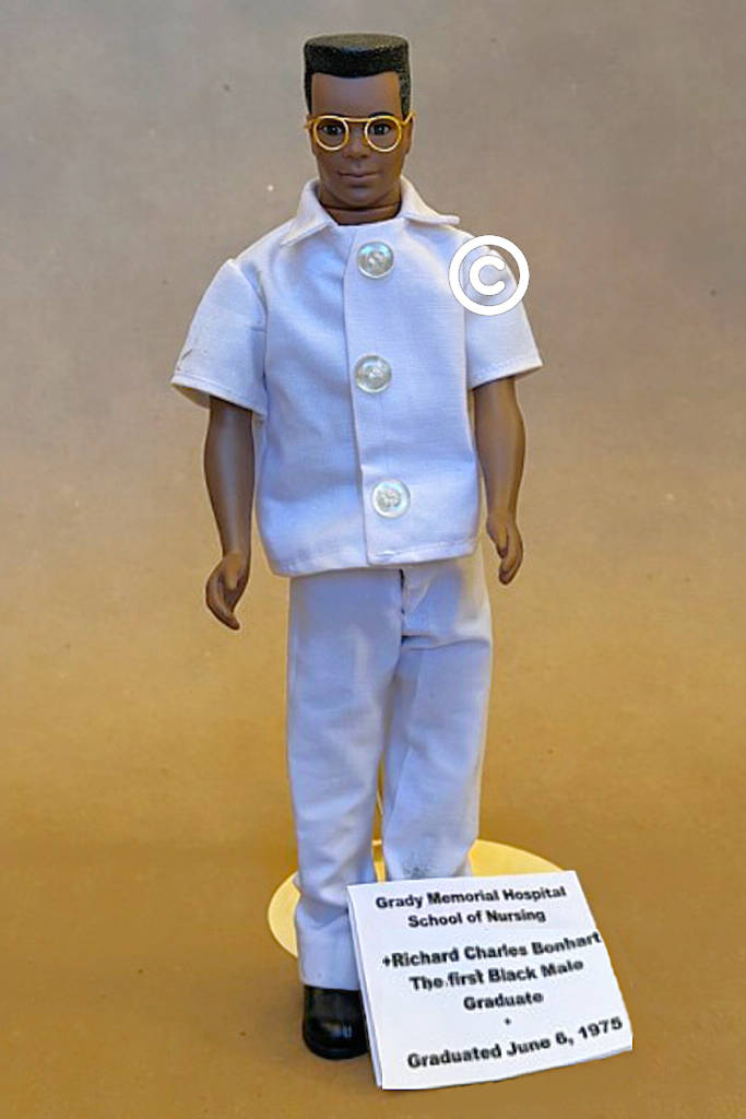 1975. The male doll represents Grady Memorial Hospital School of Nursing’s first Black male nurse graduate, Richard Charles Bonhart. Mr. Bonhart graduated on June 6, 1975. The uniform includes a white short-sleeved shirt with a point collar and button closure, white pants, and black shoes. The wire-rimmed eyeglasses are an added accessory. Olmec’s 11-1/2-inch Menelik is the 1975 male nursing student uniform model.