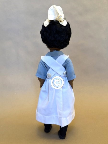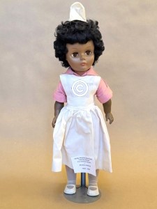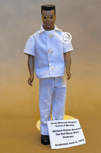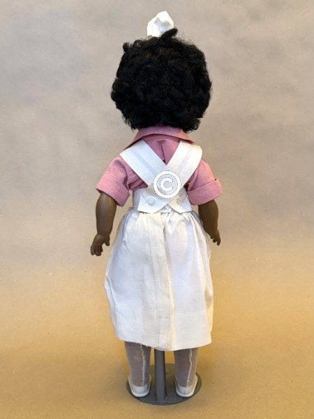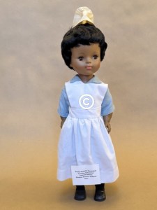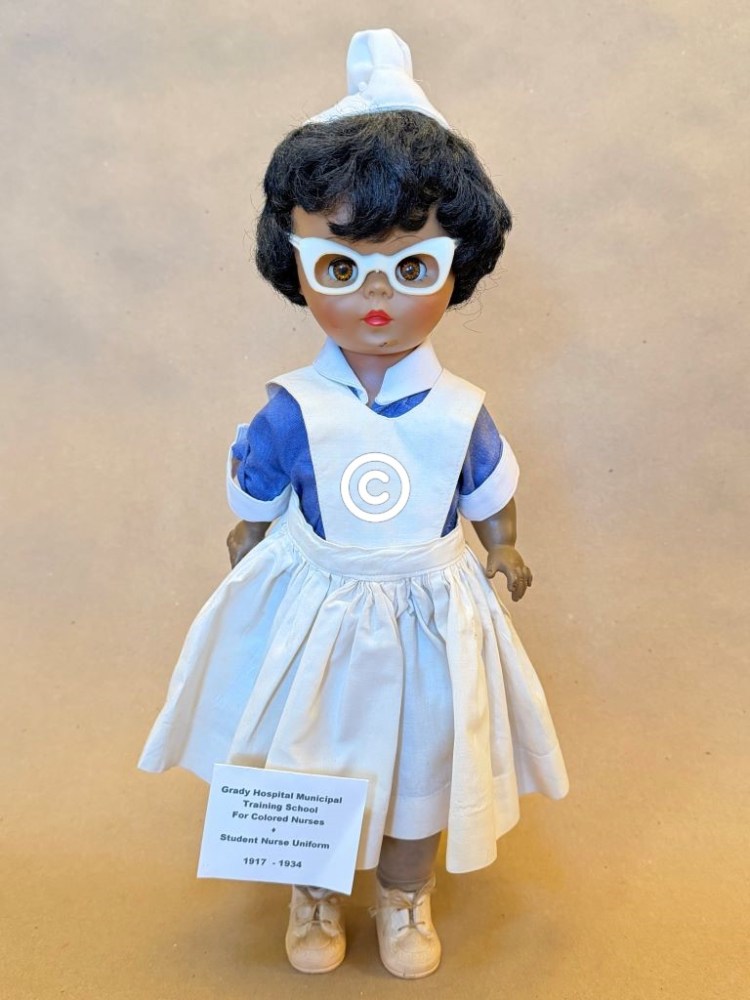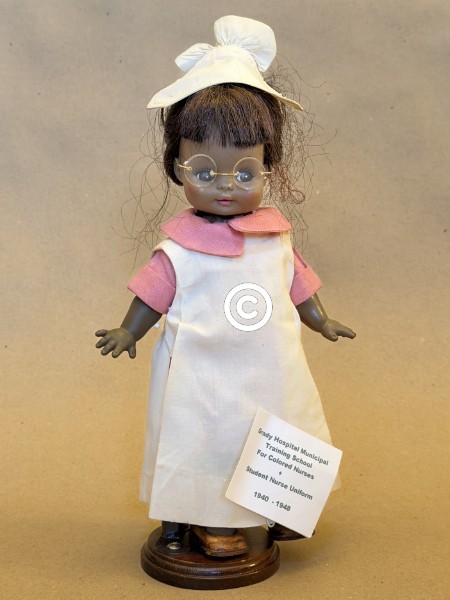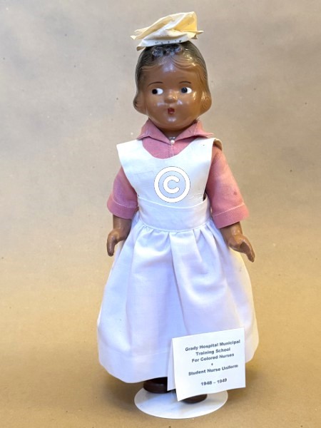 Description: This installation documents 10 dolls (nine Black and one White) by various, mostly unknown makers, made in different years, dressed by Verdelle Bellamy, MS, RN, to portray the specific uniforms worn by student nurses enrolled in Grady Hospital’s nursing schools in Atlanta, Georgia, from 1917 through 1975. The main Grady Memorial Hospital School of Nursing was chartered in 1898 for Whites only. Grady Hospital Municipal Training School for Colored Nurses (MTSCN) was founded in 1917 as a separate training facility for Black students. The separate training programs for Black and White students continued until 1965. The lone White doll represents a circa 1949–1964 White student nurse of Grady Memorial Hospital School of Nursing.