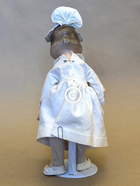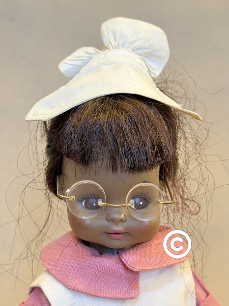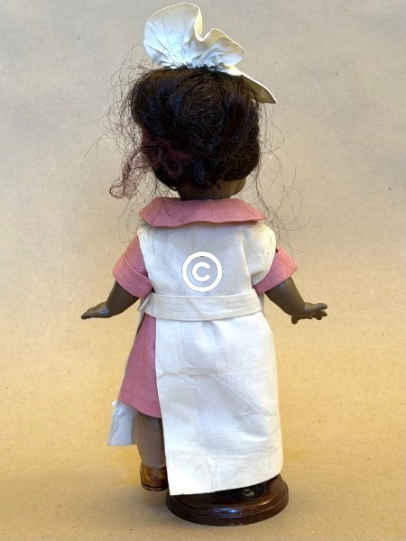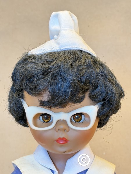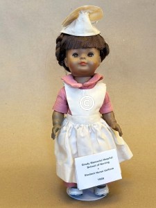 1917–1934. A 17-1/2-inch tall vinyl doll with sleep eyes models a dark blue dress with a white collar, white cuffed sleeves, a white starched pinafore-style apron, a “puffy” or gathered white nurse cap, and white nurse shoes that replicate the uniform worn by Grady Hospital MTSCN students from 1917-1934. The caps were usually heavily starched to maintain their shape. The white eyeglasses are an additional accessory, not part of the required uniform.