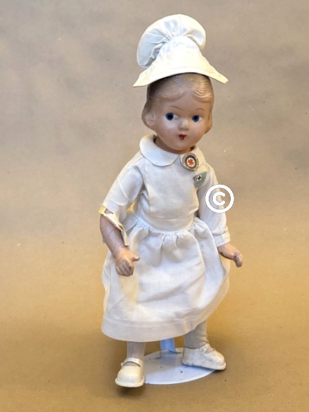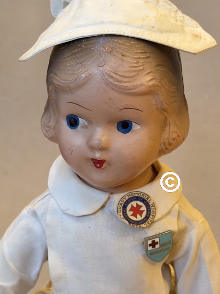 1941. (Left) A 19-inch vinyl doll with sleep eyes models a light blue dress, a below-the-knee white apron, a white cloth puffy nurse cap, black stockings, and black shoes to represent the 1941 Grady Hospital MTSCN student nurse uniform.