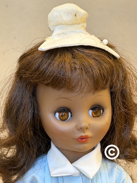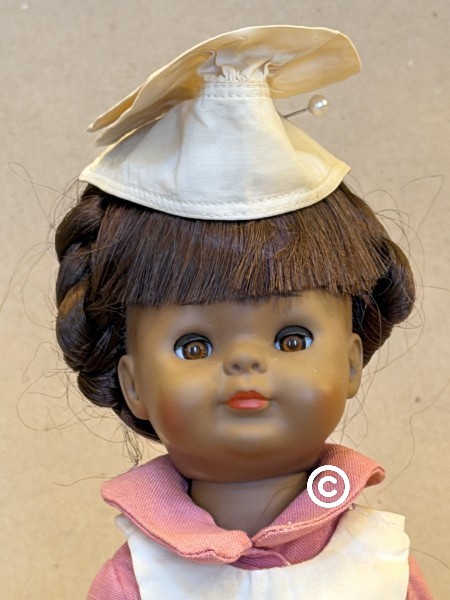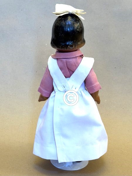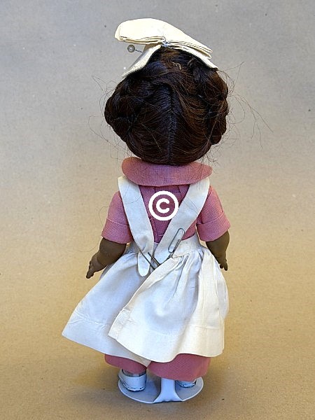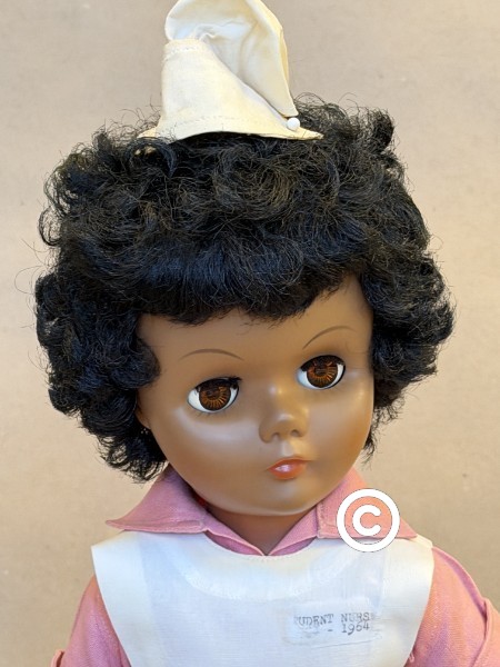 1949–1964. By this time, the Grady Hospital MTSCN student nurse uniform remained the same for several years. Black students wore a below-the-knee-length pink dress with a white pinafore apron, a white nurse cap, white stockings, and white shoes as illustrated on the left. The unknown doll model stands 19-1/2 inches and has brown sleep eyes.