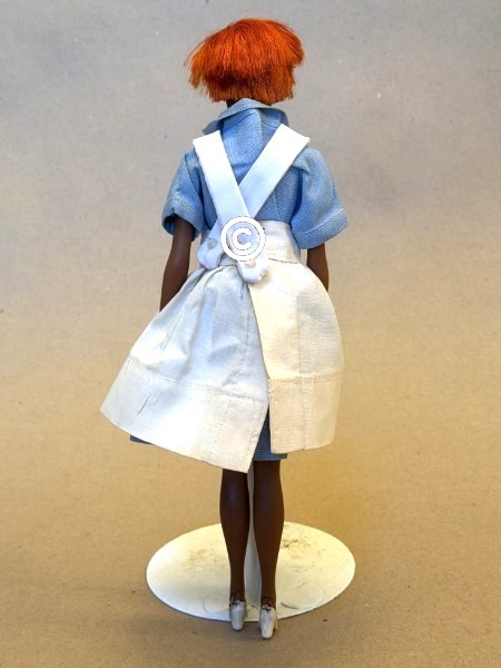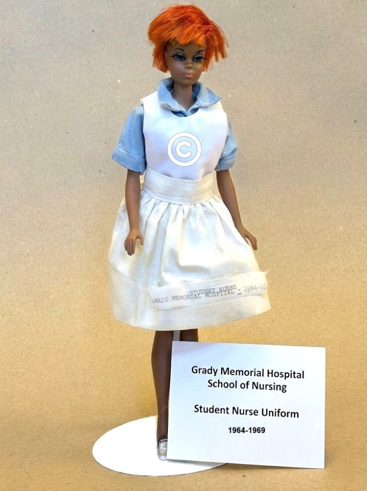 1964–1969. This doll represents the blue chambray uniform worn by student nurses when White and Black students trained in the desegregated Grady Memorial Hospital School of Nursing. A typewritten label attached to the lower skirt of this doll’s dress reads: Grady Memorial Hospital Student Nurse 1964–69. The dress label matches the doll’s object card. Missing its nurse cap, this doll wears a light-blue knee-length dress and a white pinafore-style apron with white slip-on shoes. The doll model is Mattel’s 11-1/2-inch Julia doll (1971–1972) that represents the nurse role played by Diahann Carroll in the TV series Julia, which aired from 1968–1971.