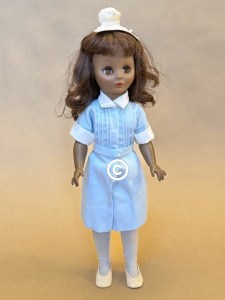 1969. The doll on the left models a replica of the Grady Memorial School of Nursing uniform worn by Black and White nursing students in 1969. A belted blue dress with a pleated bodice, a white pointed collar, and white-cuffed, three-quarter-length sleeves is worn with white stockings and white slip-on shoes. The “puffy” nurse cap remained part of the uniform. Standing 14-1/2 inches tall with brown sleep eyes, the doll model is Jill by Vogue.