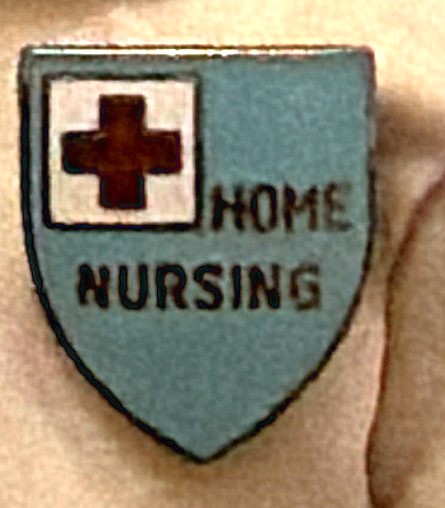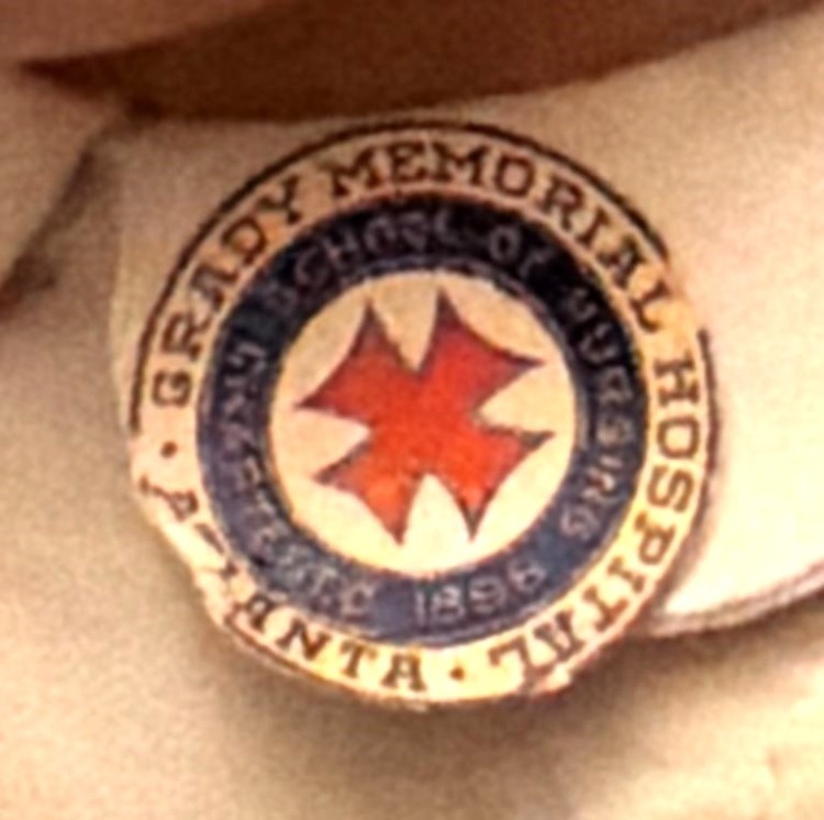1949-1964. White students who attended the Whites-only Grady Hospital School of Nursing wore the style uniform modeled by the circa 1930s composition Patsy-type doll on the right. The nursing pin on the doll’s collar was first used in 1964. The white circular area of the pin reads: Grady Memorial Hospital Atlanta. The blue area on the same pin reads: School of Nursing Chartered 1898. The doll wears a second pin that reads “Home Nursing” and has a red cross symbol within a square above and to the left of the wording. View the slideshow below for additional photos.