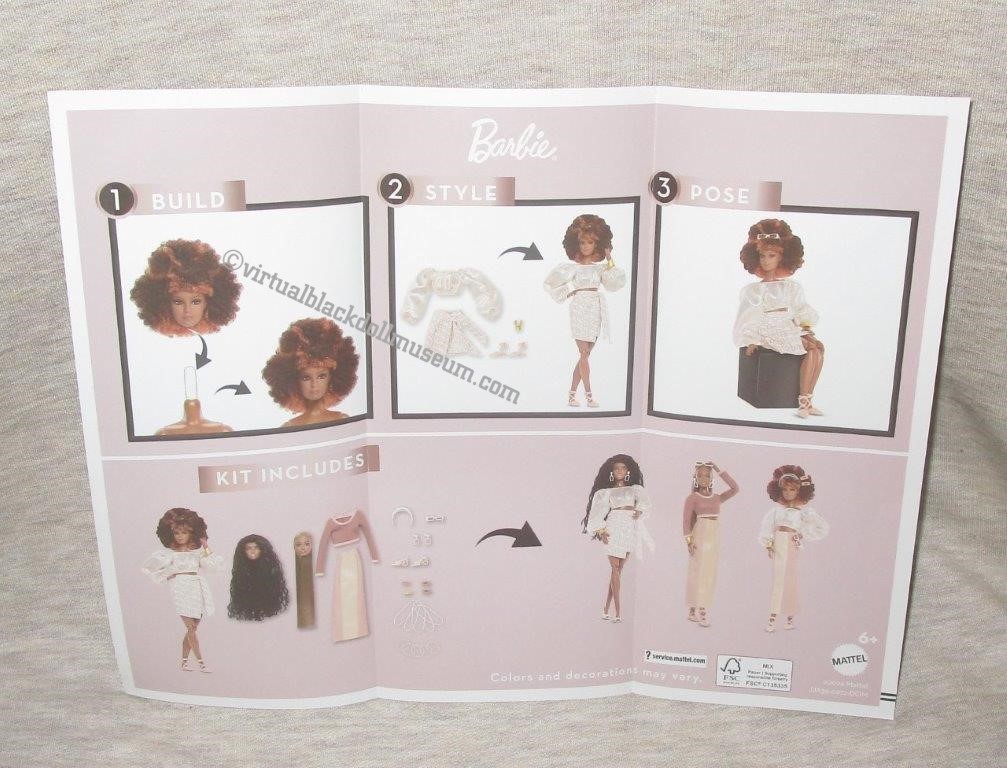 Contents: Includes one Made to Move Athletic Barbie body with the Tango head pre-attached, two extra different heads with different rooted hairstyles, colors, and textures; painted eyes, mix and match neutral fashions, coordinating shoes and accessories (as described below), a doll stand, a certificate of authenticity, and a tri-fold styling sheet. The heads in this kit are Tango (redhead), Elle (black twists), and Pazette (blonde). Tango and Elle have closed mouths. Pazette has parted lips with painted teeth.