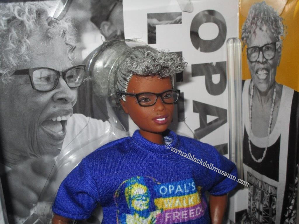 Clothes: Representing Dr. Opal Lee’s annual “Opal’s Walk for Freedom,” the Opal Lee Barbie wears a royal-blue short-sleeved graphic T-shirt with an “Opal’s Walk to Freedom” graphic. The graphic features a headshot of Dr. Lee and is paired with white pants and red, white, and blue low-top sneakers. Wears black-rimmed eyeglasses.