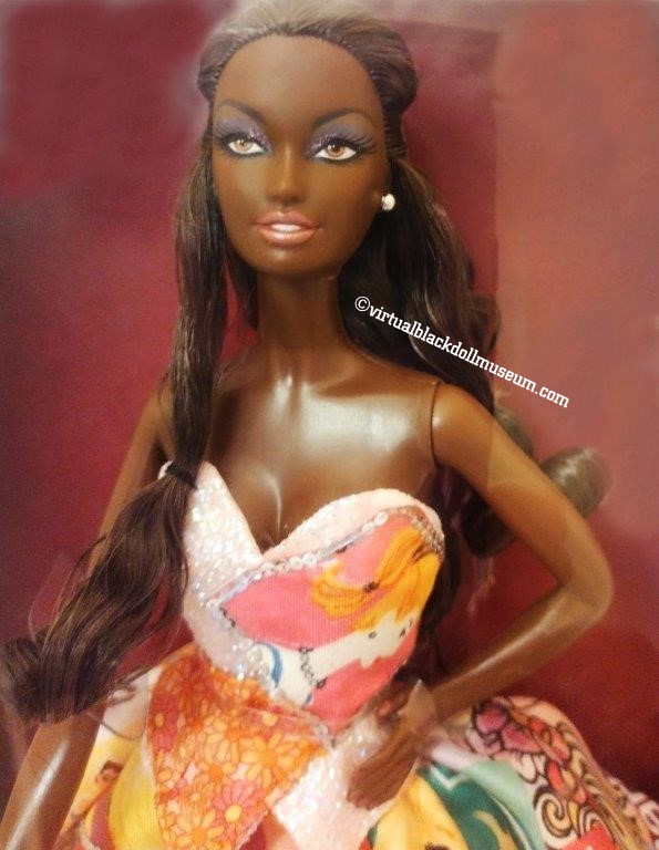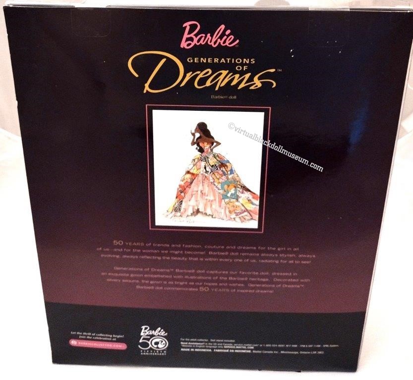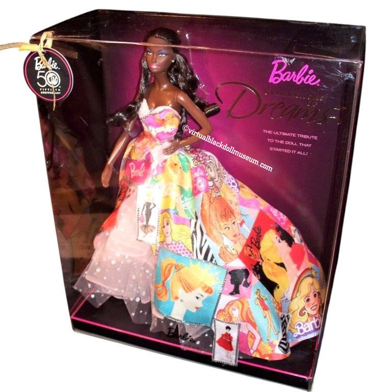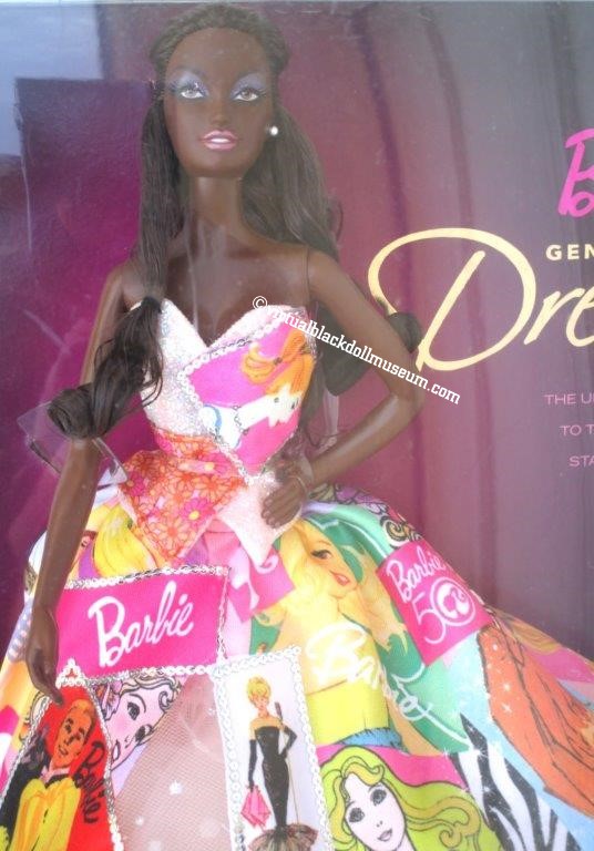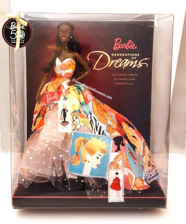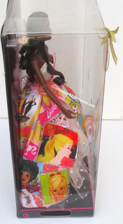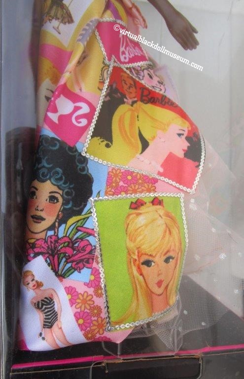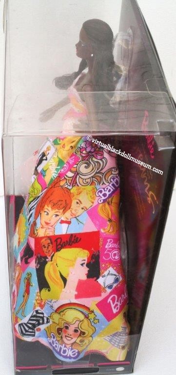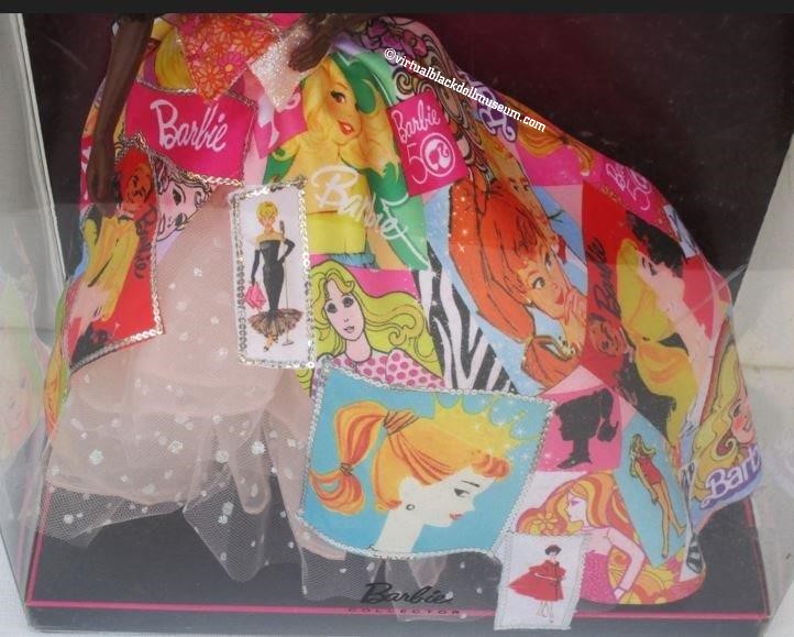 Other: Part of Barbie’s 50th Anniversary Celebration, this doll pays homage to 50 years of Barbie’s “trends and fashions, couture and dreams,” with only one image of the first Black Barbie relegated to the lower right side, extending to the back of the dress, which, unfortunately, is not readily visible; see the 5th and 7th gallery photos.