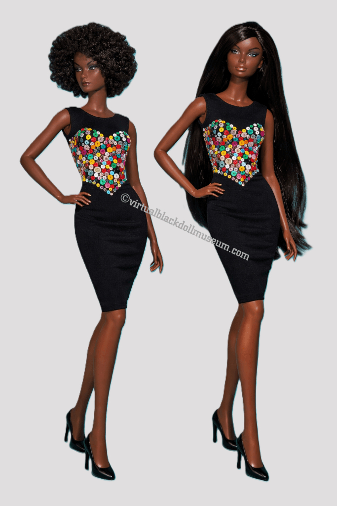 Clothes: Elara dolls are sold nude by the manufacturer to be dressed in clothing and accessories made by XianXian (XX) Toys. In the gallery photos, Afro Elara wears a brown faux leather top and shorts ensemble from the XX Earth Collection. Straight-haired Elara wears a two-piece white top and pants ensemble from the Navitation Collection. In a combined photo, the dolls wear ensembles from the Cool Girl Collection. In the last gallery photo, they wear an AI-created, Patrick-Kelly-inspired black sheath embellished with a heart-shaped button-decorated bodice. Fashions made for similarly sized dolls usually fit Elara dolls.