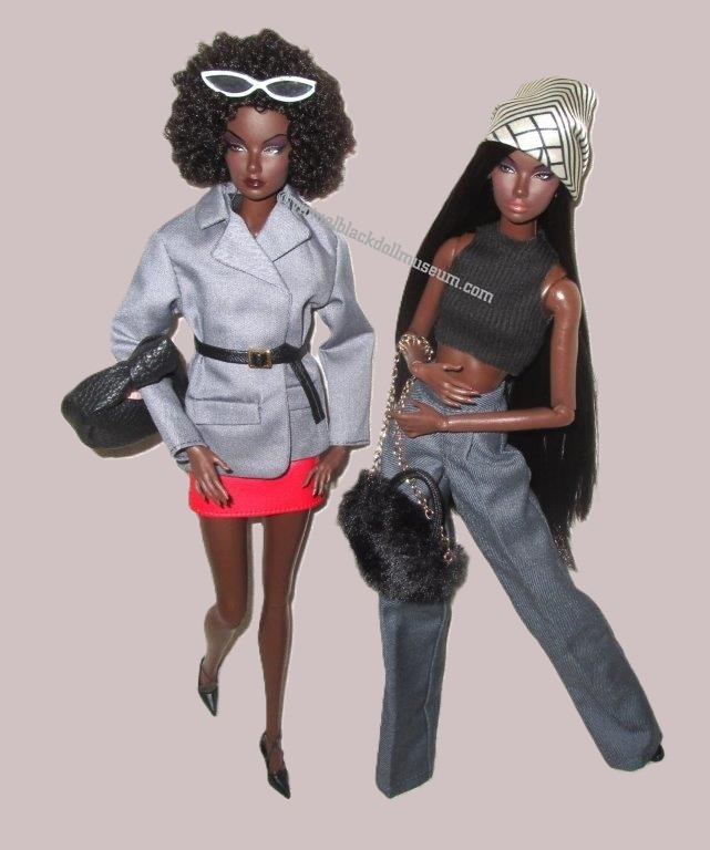 Top to bottom, left to right: Afro Elara wears a brown faux leather top and shorts ensemble from the XianXian Earth Collection. Straight-haired Elara wears a two-piece white top and pants ensemble from the Navitation Collection. In a combined photo, bottom left, the dolls wear ensembles from the Cool Girl Collection. Bottom right, they wear an AI-created, Patrick-Kelly-inspired black sheath embellished with a heart-shaped button-decorated bodice.
