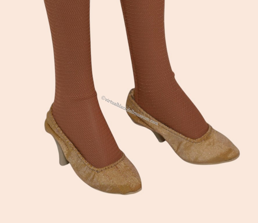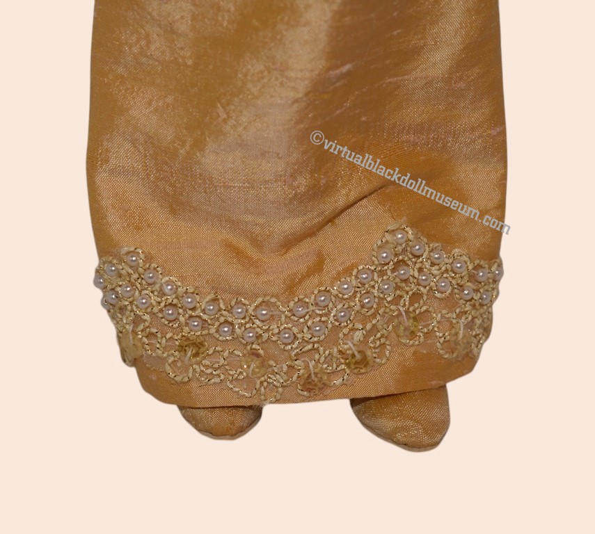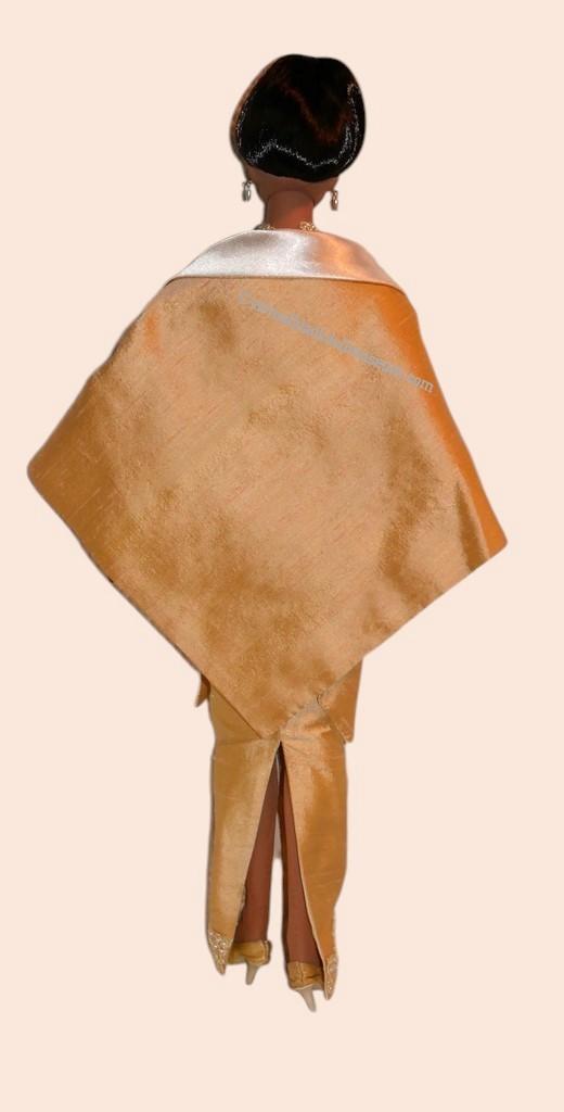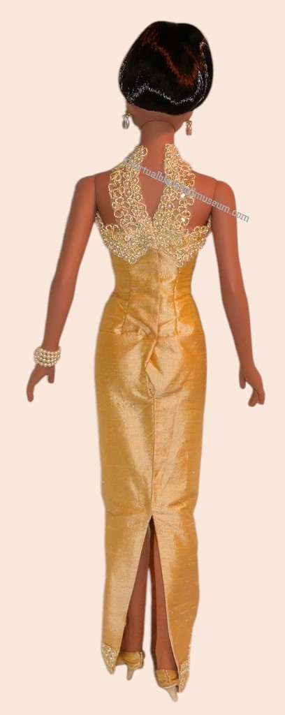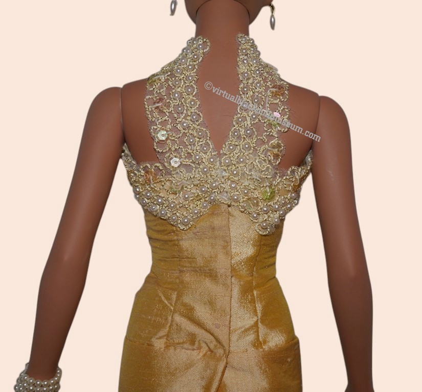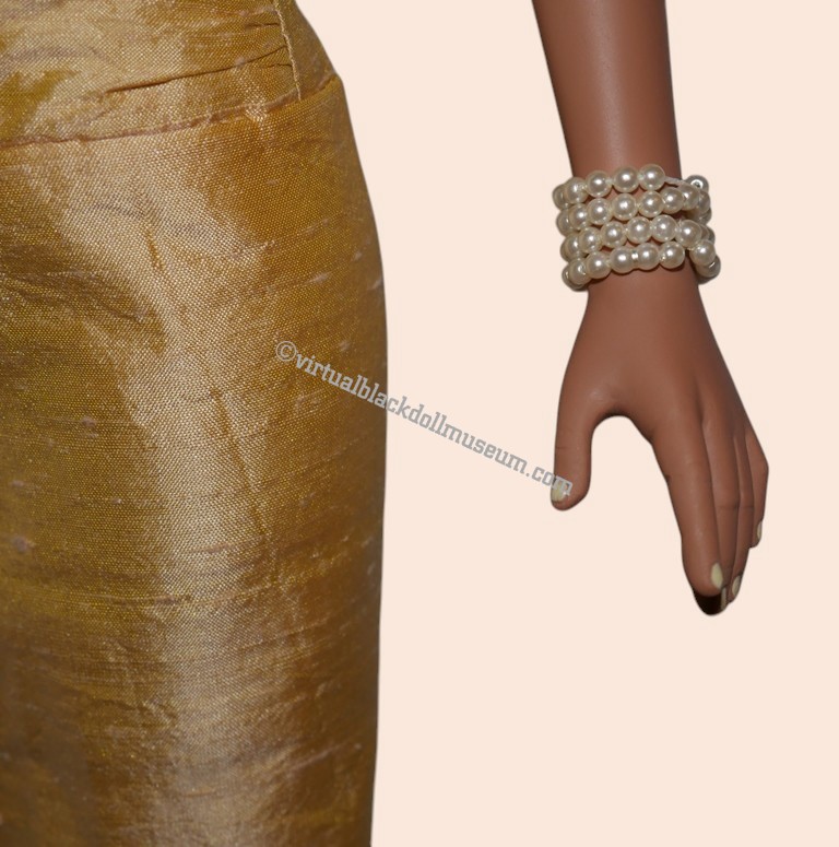 Clothes/Accessories: Full-length gold silk halter gown lined with white fabric and embellished with tiny pearl trim at the neck, upper bodice, and hemline; matching white-satin-lined, V-shaped wrap; nude hose, gold silk fabric pumps, a multi-strand pearl bracelet, and pearl drop earrings, includes a display stand. Jasmine has manicured nails.