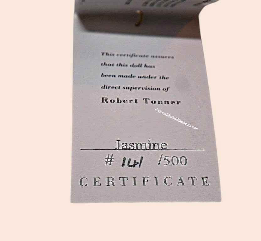 Marks: (Head) ©1995; (stamped on the lower right buttocks) “Jasmine” 99700; (handwritten on the lower right buttocks) #141/500, and ROBERT / TONNER is incised underneath. Has a hang tag/certificate indicating this doll is #141 in a limited edition of 500.