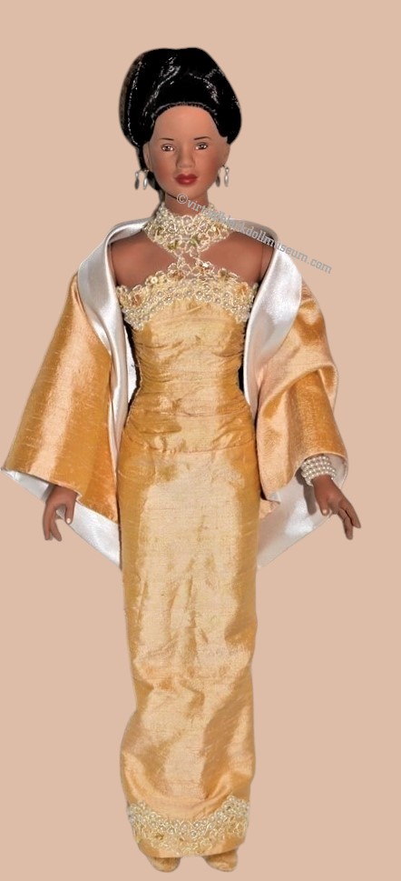 Other: Jasmine is from Robert Tonner’s original 1990s limited-edition American Models Collection of 19-inch dolls dressed in haute couture fashions. Jasmine is #141 in the edition. Other African American dolls in the collection include Shonda (1995), Carol (1996), Beverly Bride (1996), Colette Bride (1997), and Olivia (1998). Tonner later introduced 21- to 22-inch dolls in a different American Models Collection during the mid-2000s (follow the link below the gallery).