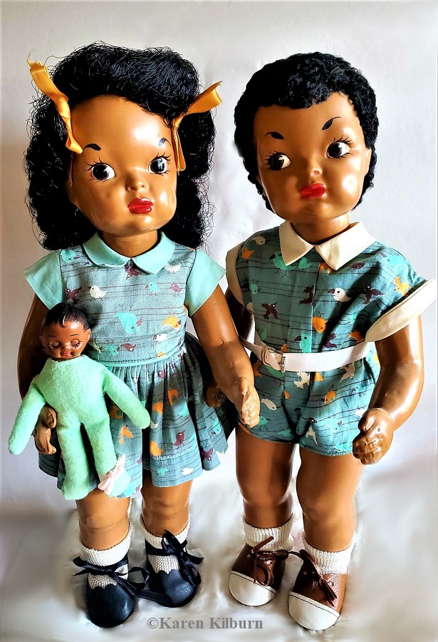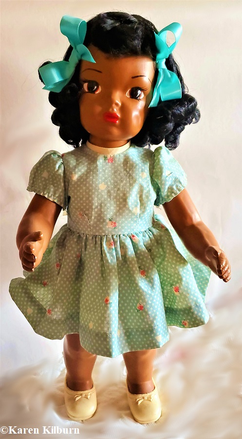 Name: Walking African Girl Made by and When: Pedigree, 1950s Material: Hard plastic Marks: Pedigree (on the neck) Height: 16 inches Hair/Eyes/Mouth: Black astrakhan wig/brown flirty eyes/red painted lips with two inserted upper teeth Clothes: Period-appropriate red circle-print dress, red Cinderella-marked sandals, gold-tone hoop earrings Other: During the 1950s and prior, Pedigree used very deepContinue reading “Walking African Girl”