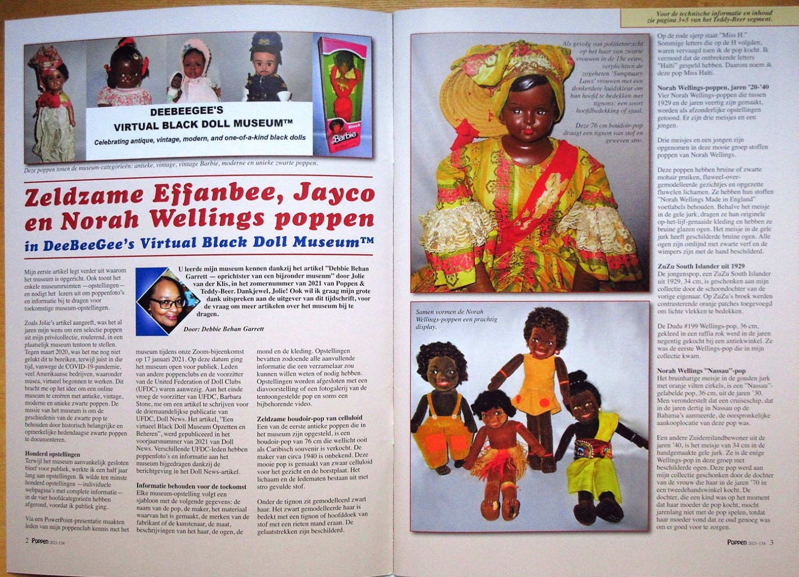 An article about antique dolls installed in DeeBeeGee’s Virtual Black Doll Museum is in the Winter 2021 issue of Poppen & Teddy-Beer, which is distributed in the Netherlands and printed in Dutch. Jolie van der Klis, a contributing writer for the magazine, shared photos of the magazine cover, the table of contents, and the pages ofContinue reading “Poppen & Teddy-Beer Museum Article #1”