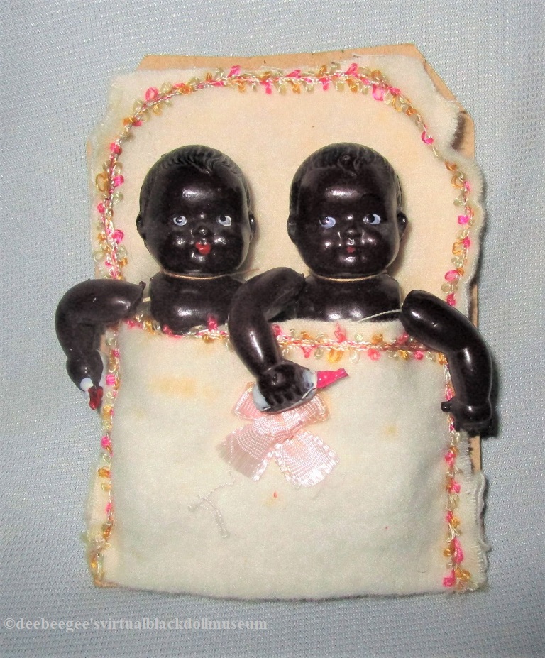 Name: Celluloid Babies in Bunting Made by and When: Unknown maker, made in Japan circa 1930s Material: Celluloid Marks: Japan (stamped on the back of the cardboard that is attached to bunting) Height: 5 inches Hair/Eyes/Mouth: Molded/painted eyes and mouths Clothes: None Other: Dolls are inside their original white flannel bunting that is attached toContinue reading “Celluloid Babies in Bunting”