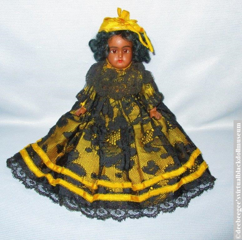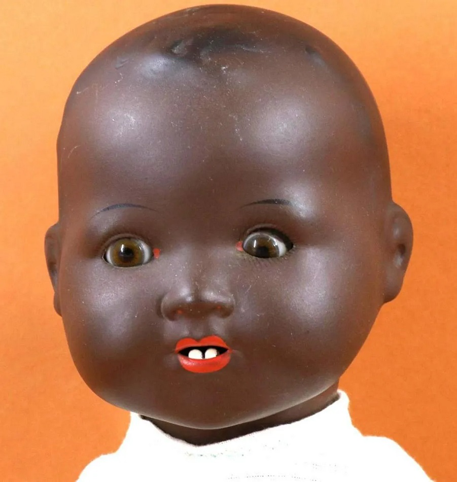 Made in Germany, an early 1900s bisque and composition 17-inch doll by Gebruder Kuhnlenz uses their mold 34-27, designed for brown- and black-complexioned dolls. #dollmadeingermany #antiqueblackdoll #gebruderkuhnlenz #bisqueandcompositiondoll