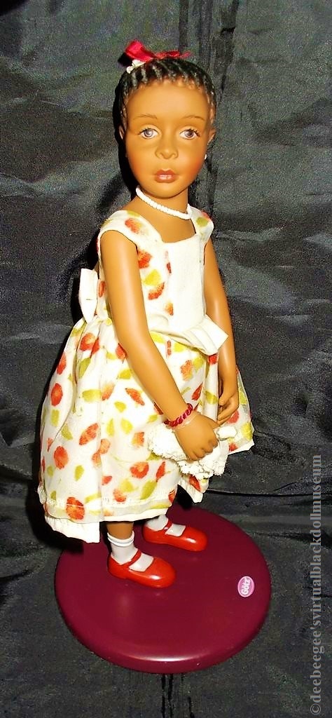 Name: Eliza Made by and When: Ulrike Hutt for Gotz for United Federation of Doll Clubs Material: Vinyl Marks: Artist’s incised mark that looks like a U above an H (on the back); #397/500/2002 (handwritten on the lower back); the dress is tagged Gotz. Height: 10 inches Hair, Eyes, Mouth: Sculpted brown cornrows, brown paintedContinue reading “Eliza by Ulrike Hutt”