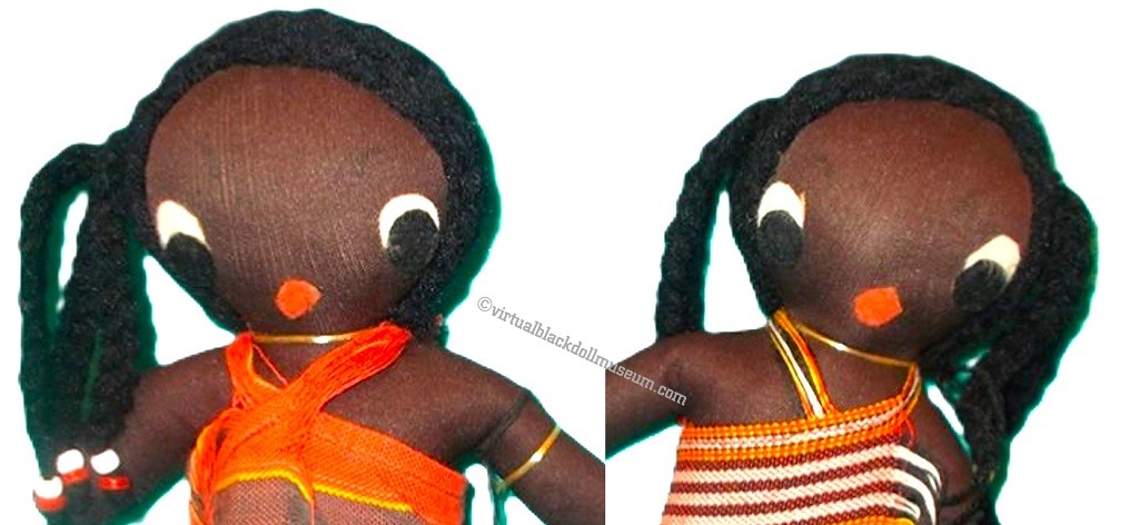 Stuffed brown cloth dolls made by Dolls From Kenya, ca. 1990s, represent the traditional hairstyles and fashions worn by modern Kenyan women. #kenyadolls #Africadolls #dollsmadeinAfrica #dollsmadeinKenya #blackclothdolls #handmadeblackclothdolls