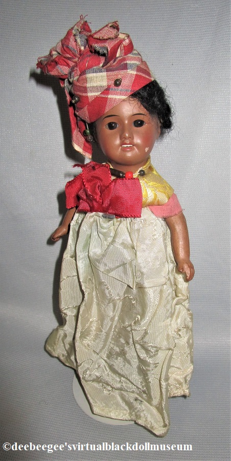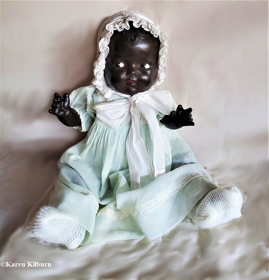 Photographs courtesy of Karen Kilburn Name: Composition Baby (Made in England) Made by and When: Unknown, circa 1930s-1940s Material: Lightweight composition Marks: Unmarked Height: 20 inches Hair/Eyes/Mouth: Sculpted black hair with widow’s peak of curls/side-glancing black painted eyes with a red dot in the inner corner of each/slightly parted dark red lips and painted tongueContinue reading “Composition Baby Made in England”