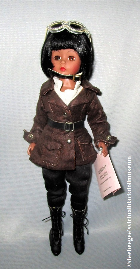 Name: Bessie Coleman Made by and When: Madame Alexander, 2009 Material: Hard plastic Marks: (On the back) ALEXANDER Height: 10 inches Hair, Eyes, Mouth: Black wig styled in a bob with bangs, brown sleep eyes with attached molded upper eyelashes and painted lower eyelashes, closed mouth with painted red lips Clothes: The doll’s very detailedContinue reading “Bessie Coleman”