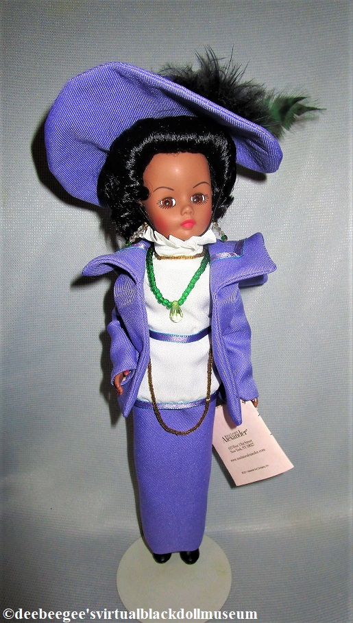 Name: C. J. Walker Made by and When: Madame Alexander, 2011 Material: Hard plastic Marks: (On the back) ALEXANDER Height: 10 inches Hair, Eyes, Mouth: Black wig in a pinned-up, early 1900s style; brown sleep eyes with attached molded upper eyelashes and painted lower eyelashes, closed mouth with painted red lips Clothes: As described byContinue reading “C. J. Walker”