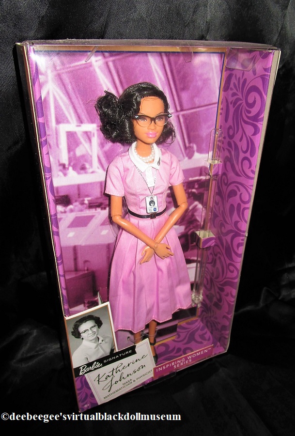 Name: Katherine Johnson Barbie Made by and When: Mattel, 2017 Material: Articulated vinyl Height: 11-1/2 inches Hair/Eyes/Mouth: Black rooted hair with flipped up ends/light brown painted eyes/slightly smiling mouth with pink painted lips Clothes: Short-sleeve pink dress has a pleated skirt, a white collar, white three-button placket, and black ribbon belt. Wears black-rimmed cat-eye glasses.Continue reading “Katherine Johnson Barbie”