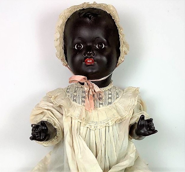 Name: Armand Marseille #2542 Composition Baby Made by and When: Armand Marseille, circa 1920s Material: Composition Marks: (Possibly marked) A.M. / 2542 7-1/2-0 Height: 25 inches Hair, Eyes, Mouth: Molded and painted black hair with sculpted curls and Widow’s peak, stationary brown glass eyes, open mouth with two upper teeth Clothes: Redressed in a christeningContinue reading “Armand Marseille #2542 Composition Baby”