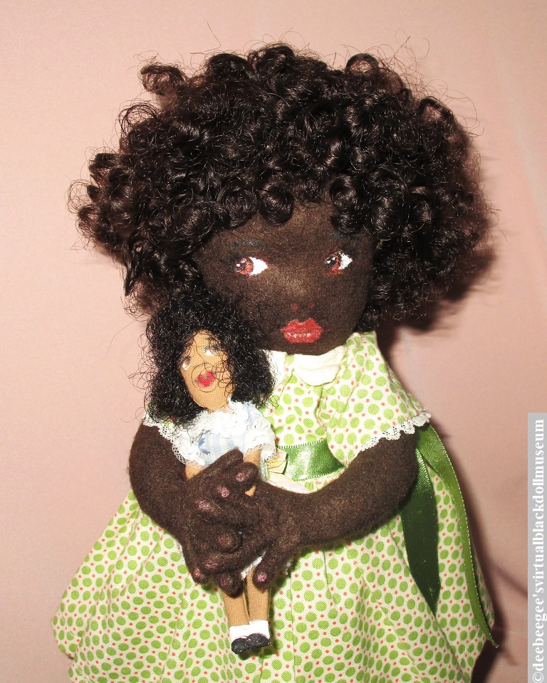 Toddler Baby is a one-of-a-kind felt doll with a mini doll. The larger doll’s dress was fashioned after a dress worn by the curator’s then-4-year-old daughter. #ooakblackdoll #ooakdoll #oneofakinddoll #feltdoll #clothdoll