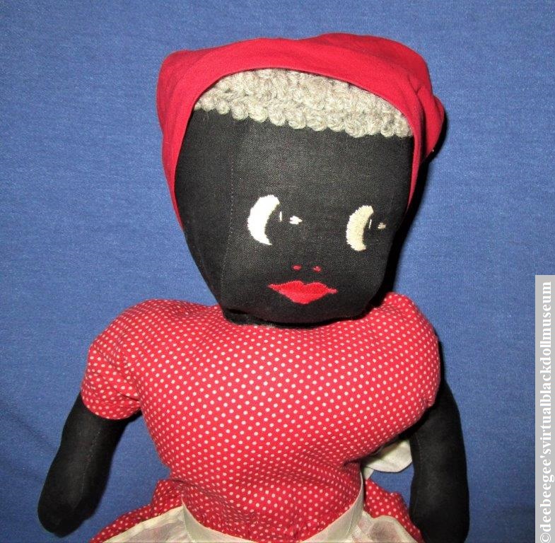 A 1920s painted-face black doll in calico dress from the Pat Hatch doll auction is featured. #antiqueblackdoll #clothdoll #handmadeclothdoll #folkartdoll #antiquemammydoll #folkartblackdoll