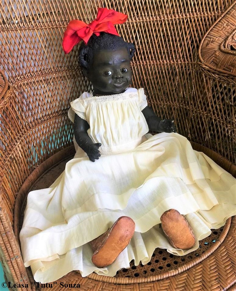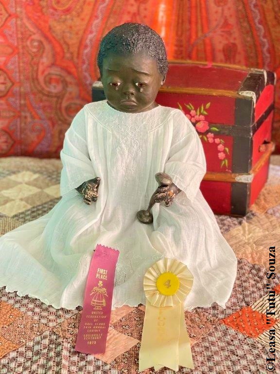 A fine example of an early 1900s one-of-a-kind, hand-sculpted baby boy doll by Leo Moss is curated and featured in this installation. #leomoss #papiermachedoll #blackpapiermache #antiqueblackdoll #leomossdoll #antiqueboydoll #ooakantiqueblackdoll