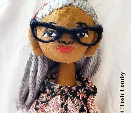 Doll artist, Tosh Fomby, created a one-of-a-kind portrait doll of renowned award-winning artist and author Faith Ringgold. #portraitdoll #faithringgold #clothdoll #artistdoll