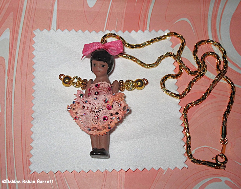 One-of-a-kind porcelain doll necklaces designed by Goldie Wilson for the WLBDA Club are featured. #goldiewilson #ooakdollnecklace #dollnecklace #clubdoll, #artistdoll