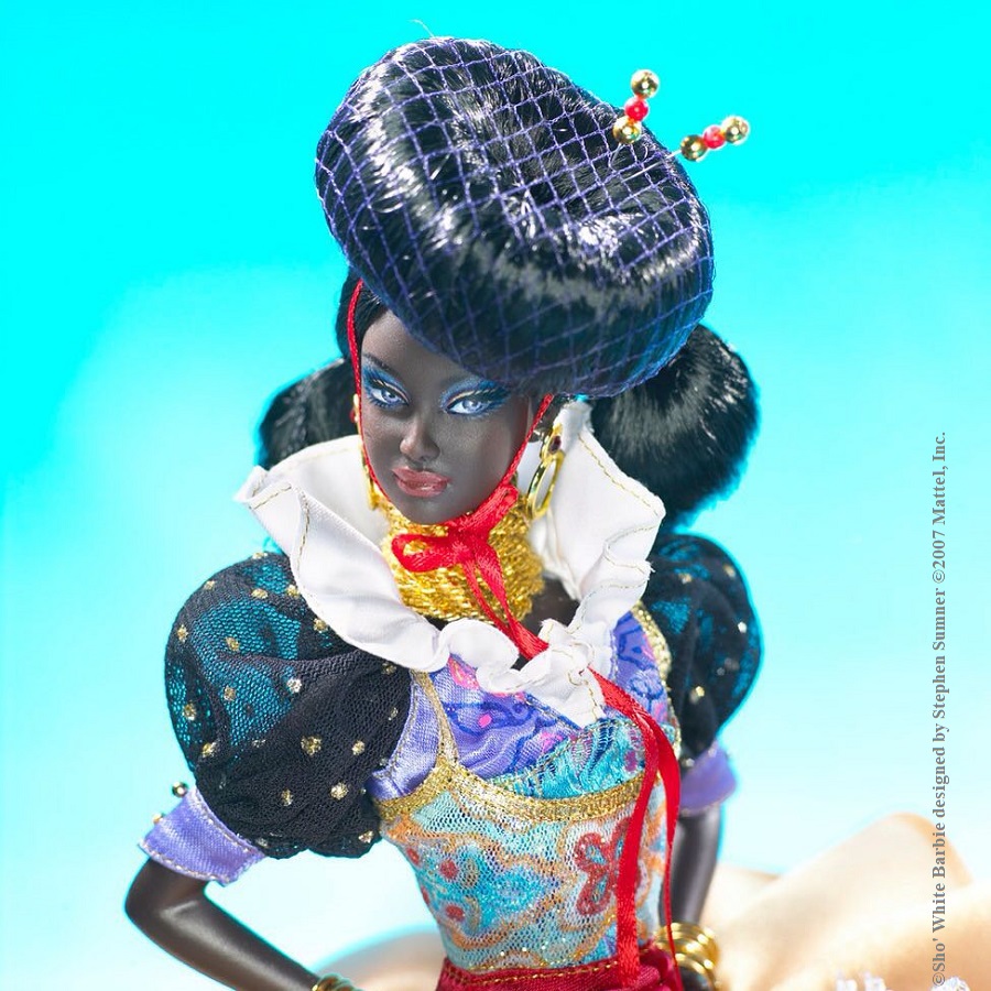 Photographs courtesy of Stephen Sumner Name: Sho’ White Barbie Made by and When: Mattel, designed by Stephen Sumner in 2007 Material: Vinyl Height: 11-1/2 inches Designer’s Description: Sho’ White is wearing a ruffled collared top with sheer puffed sleeves layered under a satin bustier. Over this is worn a mesh floral tank top with goldContinue reading “Sho’ White Barbie”