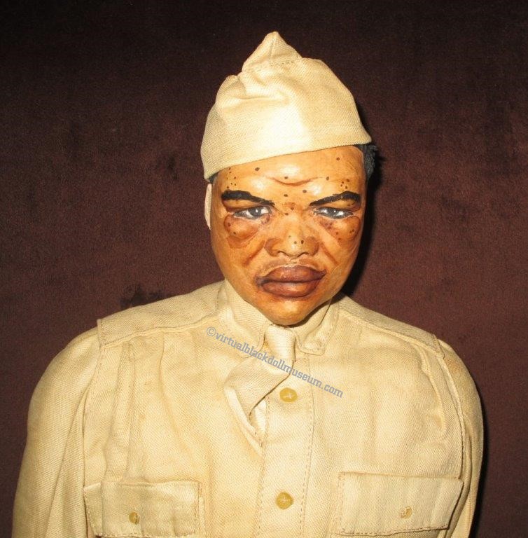 Joe Louis by Bernard Ravca, circa 1940s, is a portrait doll of championship boxer, Joe Louis Barrow. #ooakdoll #papiermachedoll #Bernardravcadoll #1940sdoll #portraitdoll #characterdoll #militarydoll #artistdoll