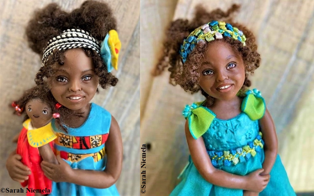Name: Dolls by Sarah Niemela (Aisha, a doll with a doll, and Tinashe*) Made by and When: Sarah Niemela, 2021 Material: Cernit (a modeling clay) Marks: Hand-signed by the artist with the year made on a signature strip attached to the dolls’ waist in the back Height: 8 inches (unjointed) Hair, Eyes, Mouth: The artistContinue reading “Cernit Dolls by Sarah Niemela”