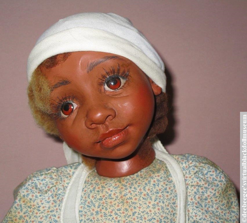 Carly is a one-of-a-kind polymer clay and cloth doll by Lorna Miller Sands from 1990 when the artist worked under the brand, Toridan Originals. #OOAKdoll #OOAKblackdoll #polymerclaydoll #Lornamiller #Lornamillersands