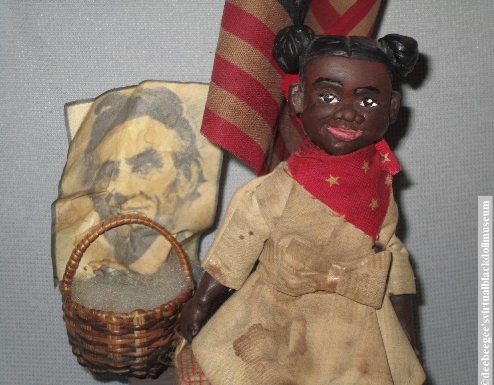 A one-of-a-kind polymer clay doll by Gloria Young represents a formerly enslaved child. #freedom #juneteenth #OOAKdoll #ooakblackdoll #artistdoll