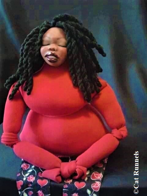 Photographs courtesy of Cat Runnels Name: Roberta from The Big Girls Valentine’s Day Shelf Sitters Series Made by and When: Patricia Coleman-Cobb, 2012 Hair/Eyes/Mouth: Black yarn locs/closed eyes/parted lips with teeth Material: Clay (face) fabric (body), and yarn (hair) Marks: Signed by the artist Height: 13 inches from head to hips with legs that hangContinue reading “Roberta, a Soft-Sculpture Art Doll”