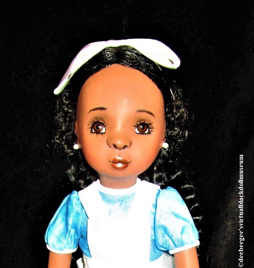 Alice in Wonderland is a limited-edition black porcelain doll by Goldie Wilson, the souvenir doll for the Maryland Society of Doll Collectors 2020 Luncheon